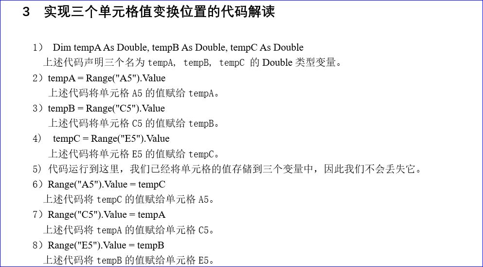 我们看下面的代码,这段代码是我第七套第一章刚开始时讲解"实现三个单元格值变换位置的代码"时给出的代码: