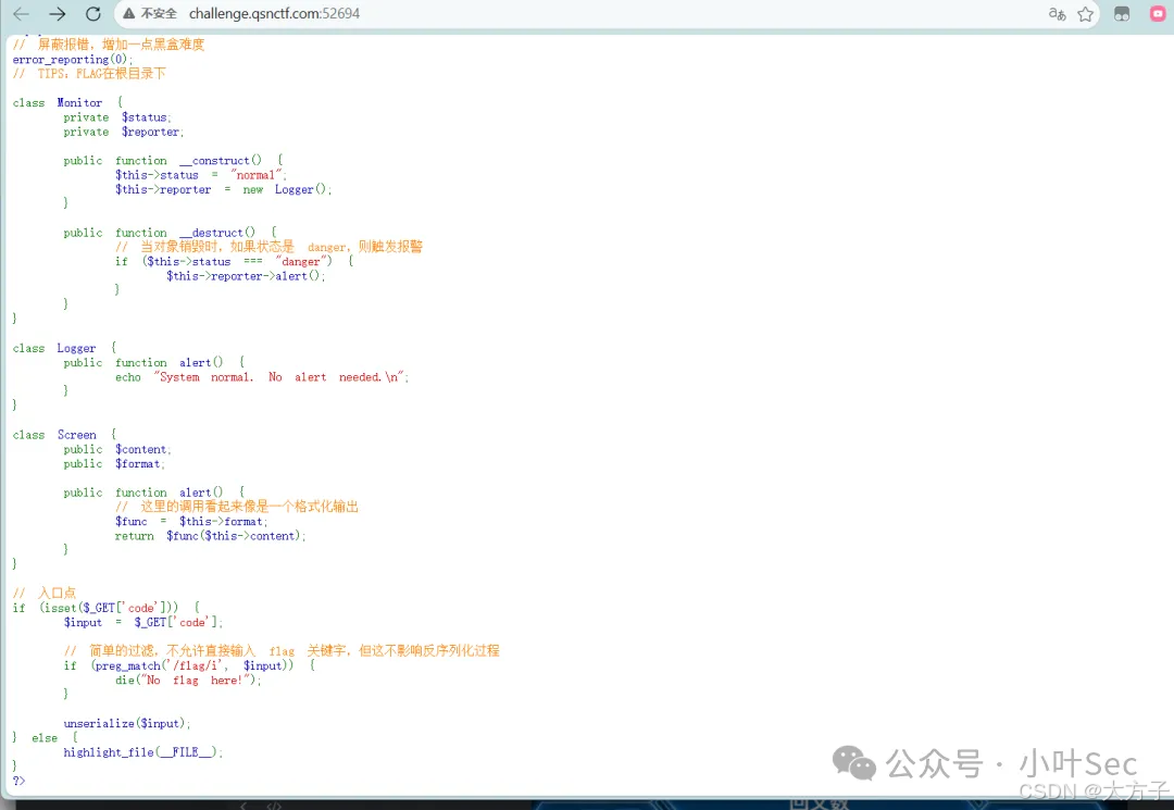 入口点:unserialize($_GET['code']),存在反序列化漏洞。