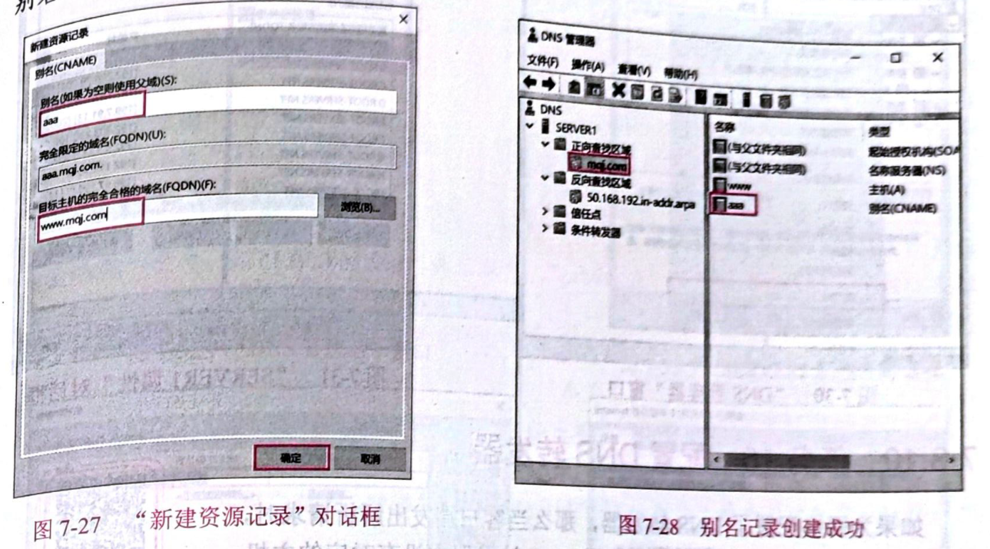步骤 1▶ 在 "DNS 管理器" 窗口中右击 "mqi.com",在弹出的快捷菜单中选择 "新建别名 (CNAME)" 选项,打开 "新建资源记录" 对话框,在 "别名(如果为空则使用父域)" 文本框中输入别名 "aaa",单击 "浏览" 按钮,在弹出的 "浏览" 对话框中选择任务 4 中创建的主机记录 "www",返回 "新建资源记录" 对话框,单击 "确定" 按钮,如图 7-27、图 7-28 所示。