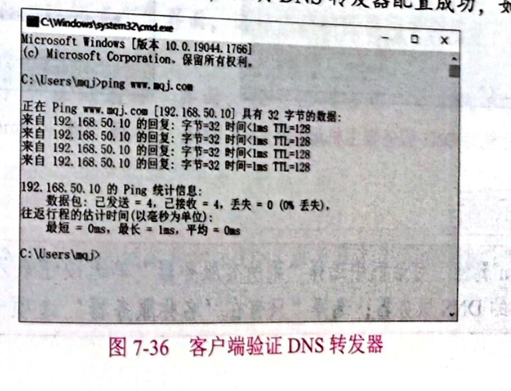 步骤 7▶ 在客户端上打开 "命令提示符" 窗口,输入命令 "ping www.mqi.com",按 "Enter" 键,如果能 ping 通 DNS 服务器,证明 DNS 转发器配置成功,如图 7-36 所示。