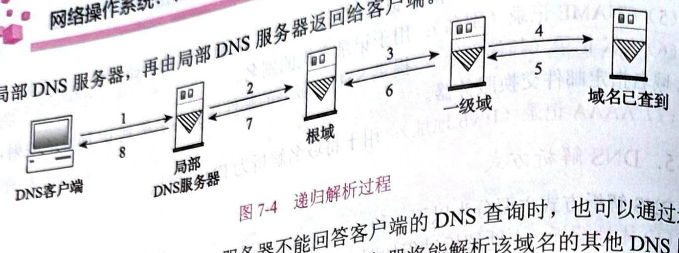 (3)递归解析:当局部 DNS 服务器不能回答客户的 DNS 查询时,它就需要向其他 DNS 服务器发送查询请求。此时有递归解析和迭代解析两种方式,如图 7-4 所示的是递归解析过程。局部 DNS 服务器负责向其他 DNS 服务器发送查询请求,通常是先向该域名的根域服务器发送查询请求,再由根域服务器一级级向下查询,最后将得到的查询结果返回给局部 DNS 服务器,再由局部 DNS 服务器返回给客户端。