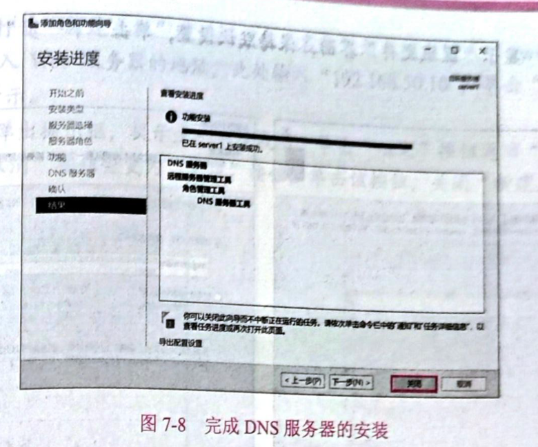 步骤 9▶ 显示 "安装进度" 界面,DNS 服务器安装完成,单击 "关闭" 按钮,关闭 "添加角色和功能向导" 窗口,如图 7-8 所示。