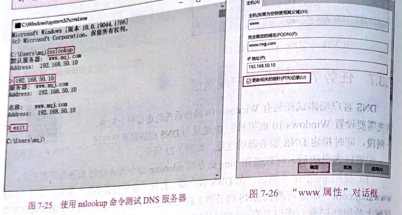 (2)使用 nslookup 命令测试:使用 nslookup 命令可在 DNS 客户端上测试 DNS 服务器的正向解析及反向解析,输入 "exit" 命令退出,如图 7-25 所示。