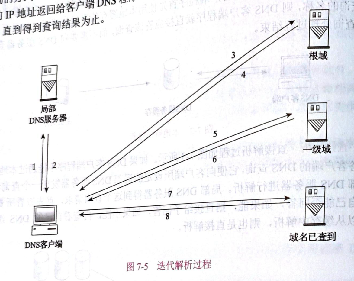 (4)迭代解析:如图 7-5 所示。当局部 DNS 服务器不能回答客户的 DNS 查询时,也可以通过迭代查询的方式进行解析。局部 DNS 服务器将解析该域名的其他 DNS 服务器的 IP 地址返回给客户 DNS 程序,客户端 DNS 程序再继续向这些 DNS 服务器进行查询,直到得到查询结果为止。