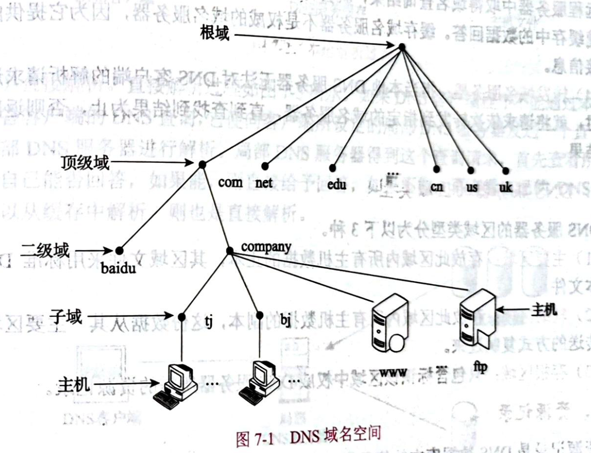 DNS 域名空间是指 Internet 上所有主机唯一的、容易记忆的主机名所组成的空间,是一种层次化的树型结构,如图 7-1 所示。其中顶层为根域(root domain),通常用圆点(.)表示;下一层为顶级域(top-level domain),顶级域是用以识别域名所属类别、应用范围、注册国家等公用信息的代码。