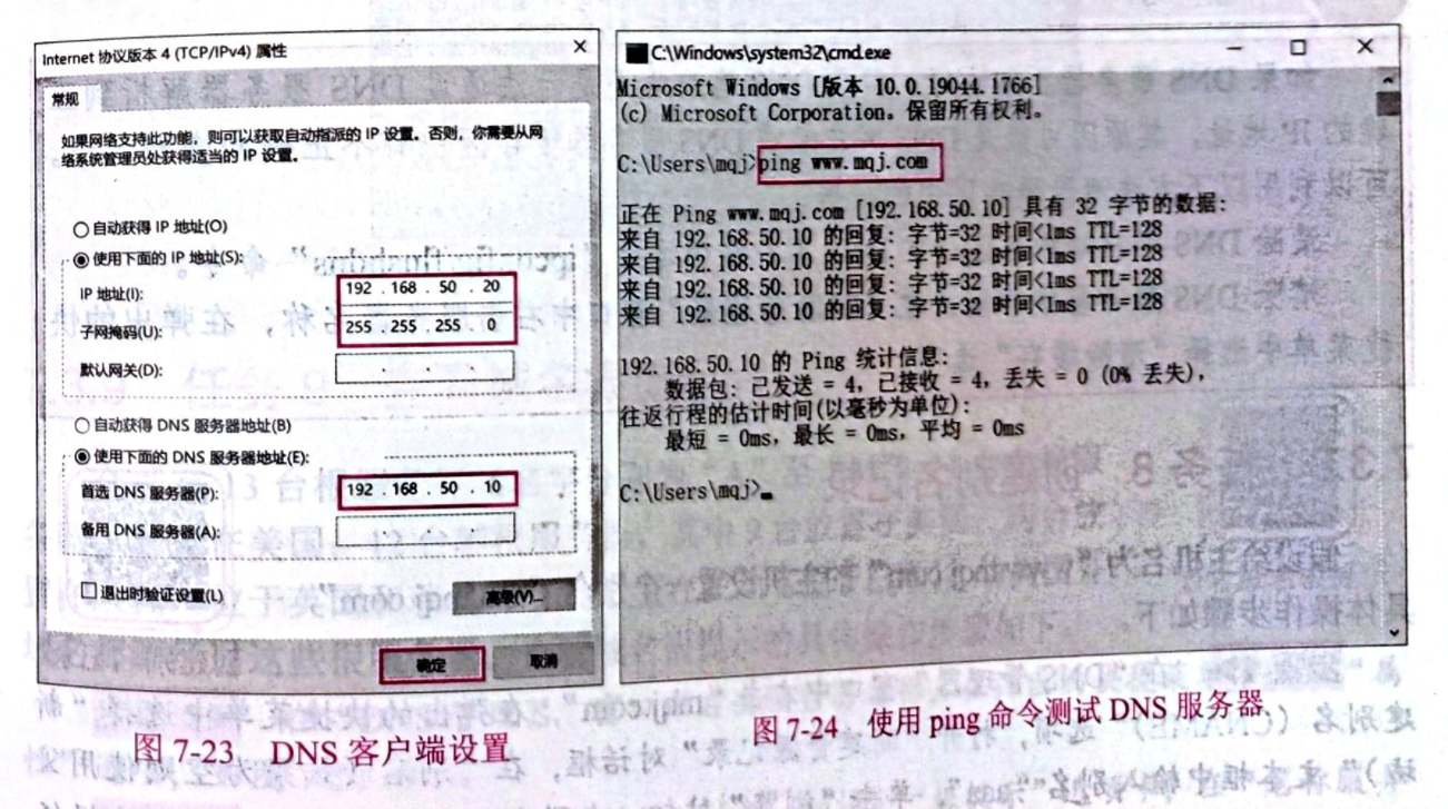DNS 客户端测试在装有 Windows 10 操作系统的虚拟机上完成。首先需要设置 Windows 10 虚拟机的 IP 地址与 DNS 服务器地址在同一网段,同时指定 DNS 服务器的地址,如图 7-23 所示。配置好客户端后,可以使用 ping 命令和 nslookup 命令测试 DNS 服务器是否正常。