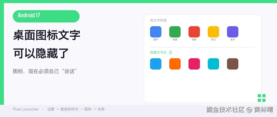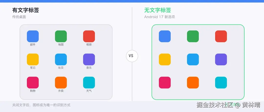 但想想 iOS 的发展路径。苹果从来没在桌面显示过 App 文件夹内的应用名,iOS 18 更是把自定义主题推到了新高度。Google 在 Android 17 跟进这个方向,说明"无文字桌面"正在从极客玩具变成主流选项。