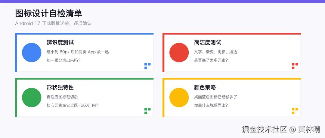 别只在 Pixel 上看。三星用圆角方形,小米用圆形,不同 ROM 的裁切逻辑不同。确保你的核心元素在所有形态下都完整。