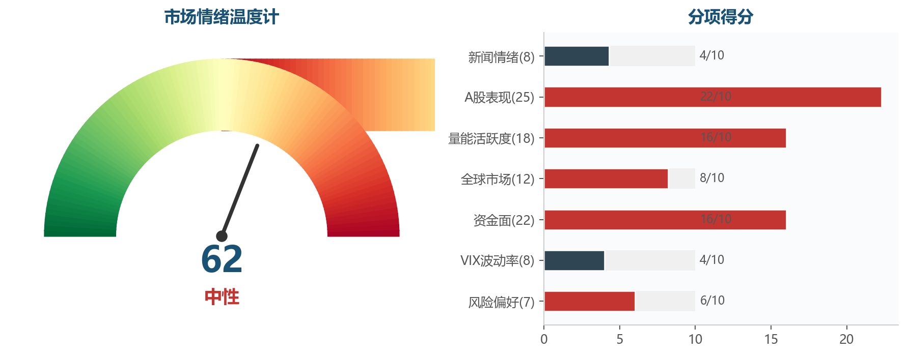 - 跨资产信号:RISK-ON(股涨+债收益率升+金跌)