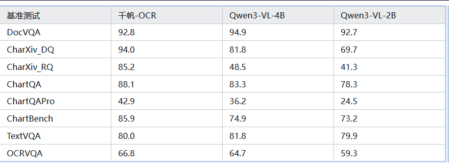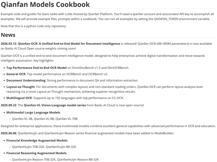 百度千帆 OCR(Qianfan-OCR) 是百度千帆团队于 2026 年 3 月发布的端到端统一文档智能大模型,主打 "单模型搞定全链路文档处理",与传统的多阶段OCR流水线(将独立的版面检测、文字识别和语言理解模块串联)不同,千帆-OCR 以4B所谓参数可执行 直接的图像到Markdown转换,并支持广泛的提示驱动任务------从结构化文档解析、表格提取,到图表理解、文档问答和关键信息抽取------全部由单一模型完成。在多项权威评测中登顶,且已开源。