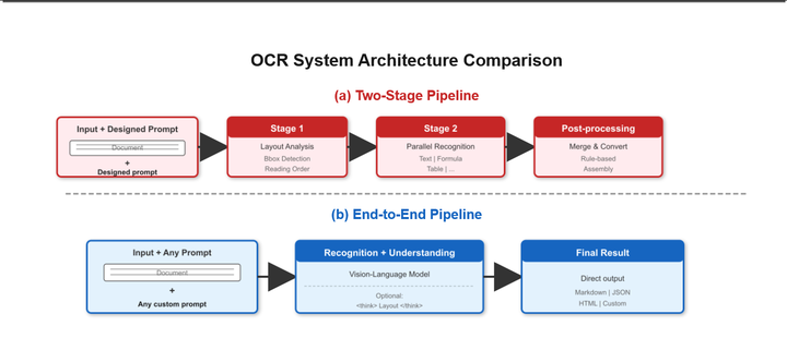 将布局分析、文本识别、语义理解整合到单一视觉 - 语言模型中,消除阶段间误差传播,全程保留完整视觉上下文(空间关系、图表结构、格式信息);简单任务(如纯文本转录)可跳过布局预处理,直接输出结果,提升效率。