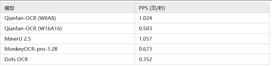 以每页 / 秒(PPS) 为核心指标(单 A100 GPU,OmniDocBench v1.5 数据集),W8A8 量化后 Qianfan-OCR 达1.024 PPS,与顶级流水线模型 PaddleOCR-VL(1.224 PPS)持平,远超其他端到端模型;