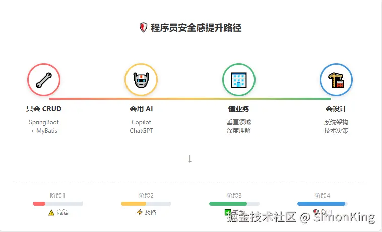 更重要的是,CRUD 的"护城河"本身就很浅。写几个 Controller,加几个 Service 层,调几个 Mapper------这套东西一个计算机专业的大三学生学两个月就能上手。