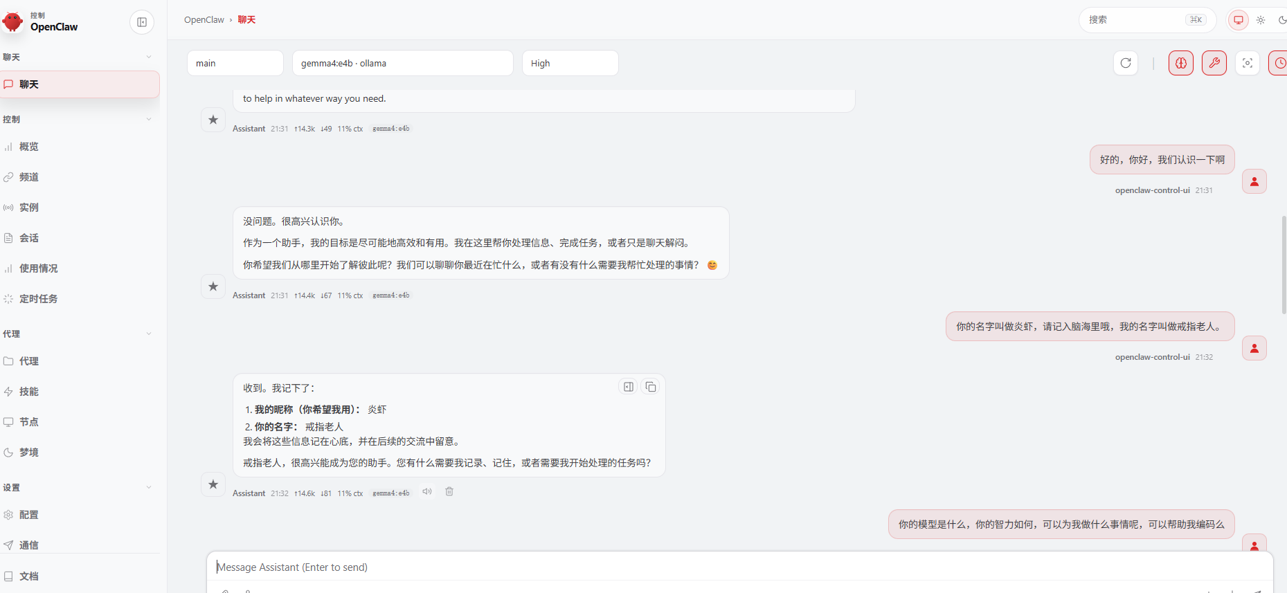 验证一下Gemma4是否可以回应,炎虾成功苏醒。