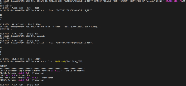 insert into "SYSTEM"."TEST1"@ORACLE11G_TEST values(2);