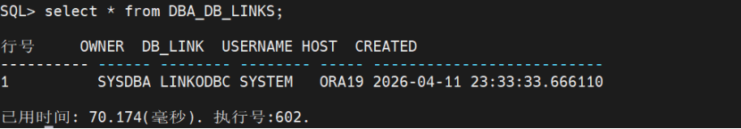 root@loaclhost unixODBC-2.3.0\]# isql -v ORA19  \[root@loaclhost unixODBC-2.3.0\]# su - dmdba \[dmdba@loaclhost \~\]$ isql -v ORA19 #### 2.5示例-**达梦中创建** **LINK** **访问ORACLE 19c使用** **create or replace link "LINKODBC" connect 'ODBC' with "SYSTEM" identified by "123456" using 'ORA19';** select \* from "SYSTEM"."T01"@LINKODBC; --查询link信息 select \* from DBA_DB_LINKS;   注:如果报错第1 行附近出现错误\[-6033\]:DBLINK连接丢失,达梦数据库要重启下。 更多达梦数据库运维指南、在线文档、相关资料、社区在线提问以及技术分享 访问 [https://eco.dameng.com/](https://eco.dameng.com/ "https://eco.dameng.com/")
