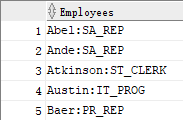SELECT last_name||' : '||job_id AS "Employees" FROM employees;