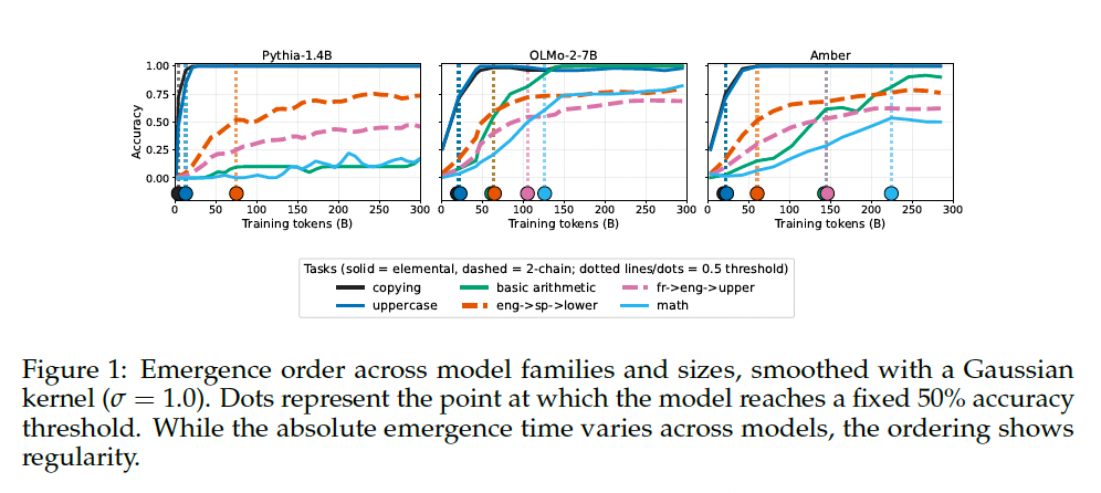 - H2. 跨模型稳定性:不同模型的涌现顺序高度相关。