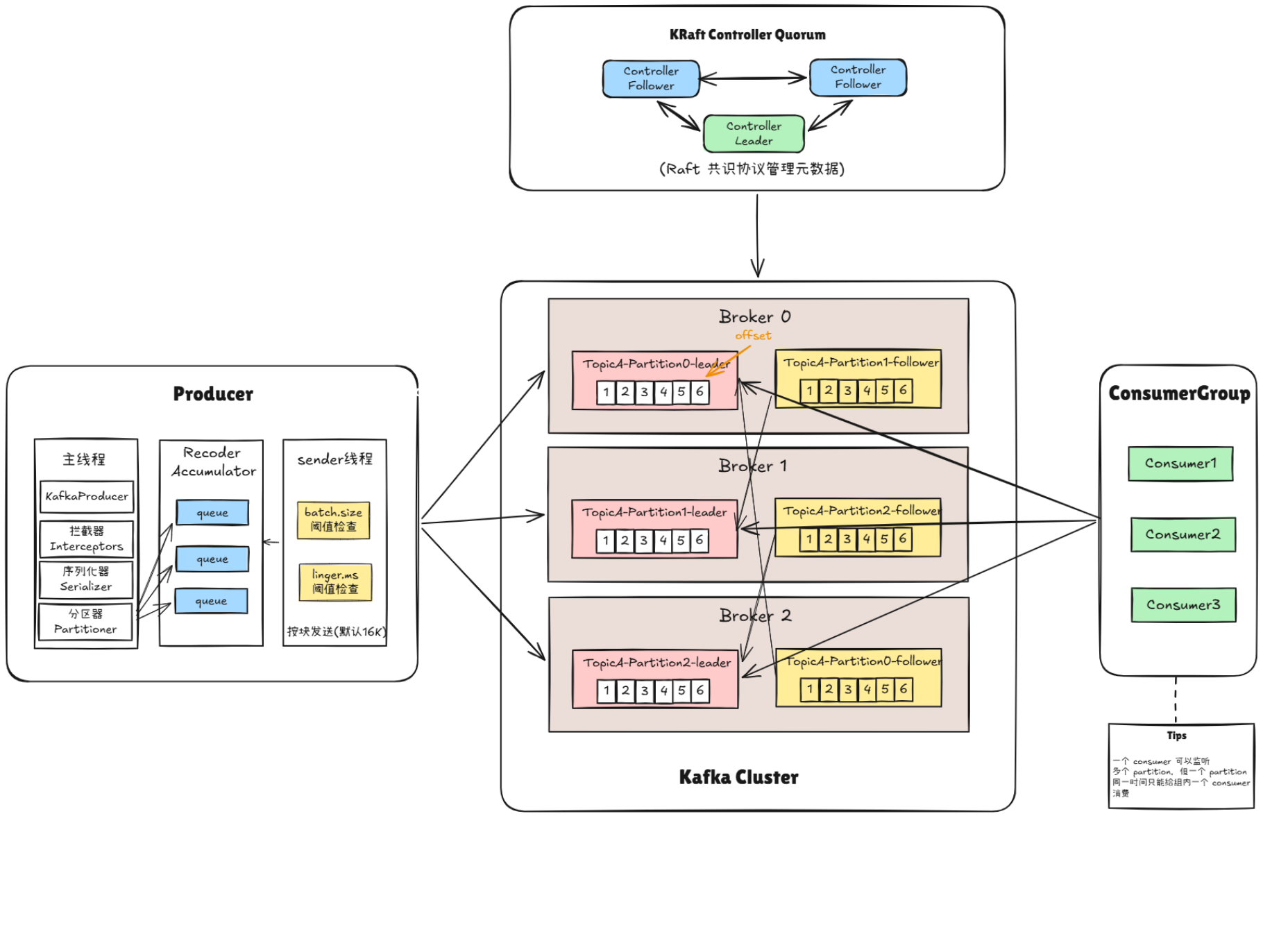 | Controller | 集群控制器,负责分区 Leader 选举、Broker 上下线管理等(KRaft 模式下由 Controller Quorum 承担) |