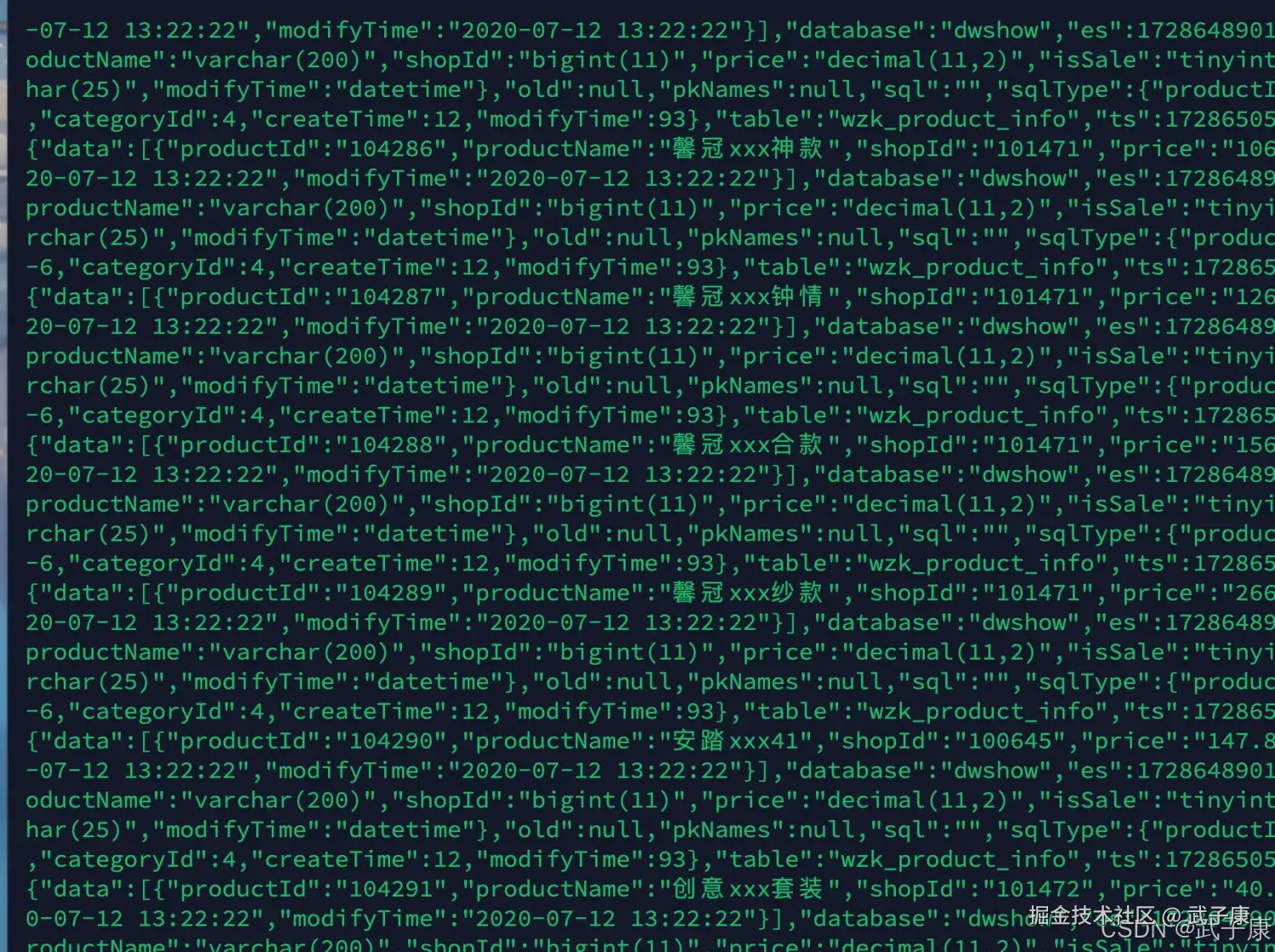 当我们操作数据库的时候,可以看到Kafka 中写入了大量的数据(这里我是消费者在监听):