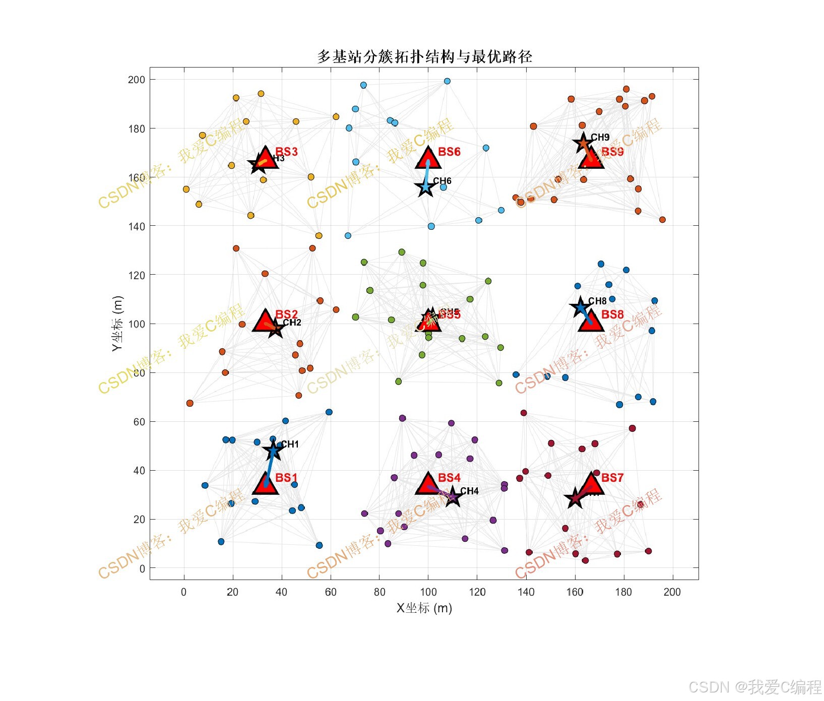 多基站部署的核心思想是:根据网络区域面积、节点密度和通信半径等参数,确定最优的基站数量与位置。设网络部署区域为边长为L的正方形区域,节点总数为N,节点通信半径为Rc。基站数目M的选择依据网络面积和通信覆盖需求确定: