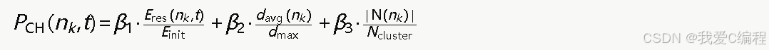 其中,Eres(nk,t)为节点当前剩余能量,Einit为初始能量,davg(nk)为节点与簇内其他节点的平均距离,dmax为簇内最大节点间距离,∣N(nk)∣为节点的邻居节点数,Ncluster为簇内总节点数。权重系数满足β1+β2+β3=1,通常设置β1=0.5,β2=0.3,β3=0.2,以强调剩余能量在簇头选举中的主导作用。