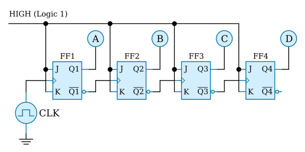 异步计数器 (Asynchronous Counter / Ripple Counter): 只有第一个触发器由外部时钟信号驱动, 后续触发器的时钟输入端由前一个触发器的输出来驱动, 这导致触发器的翻转是逐级传递的, 存在时间上的延迟, 不是同时发生的.