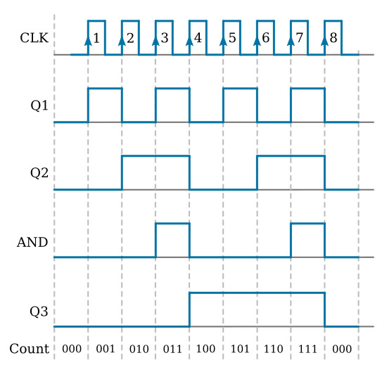 异步计数器(纹波计数器/Ripple Counter): 前级触发器的输出(Q)作为后级的时钟, 级联传递.