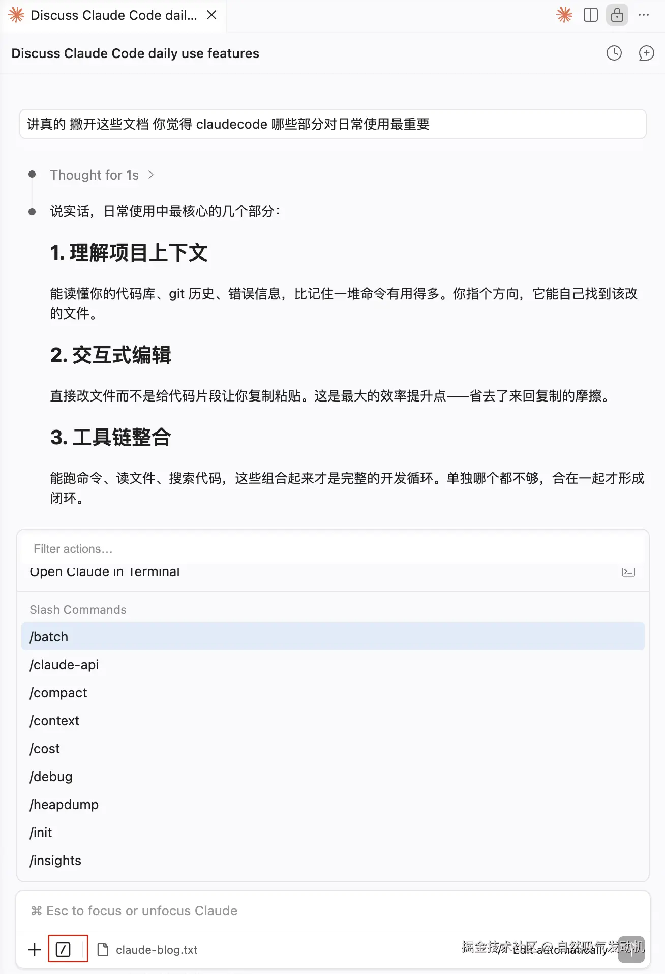 在前言的部分中我们可以看到图形化界面提供了很多的斜杠指令,对话框里输入 / 就能看到一堆内置指令。看着多,但其实日常翻来覆去用的就下面这几个。