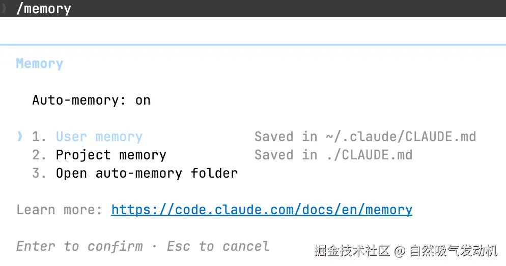 Memory 则是在 Claude 在对话中自动记下来的碎片信息------你纠正过它什么、你喜欢什么工作方式之类的。保存在 ~/.claude/projects/ 目录下,用 /memory 命令管理。