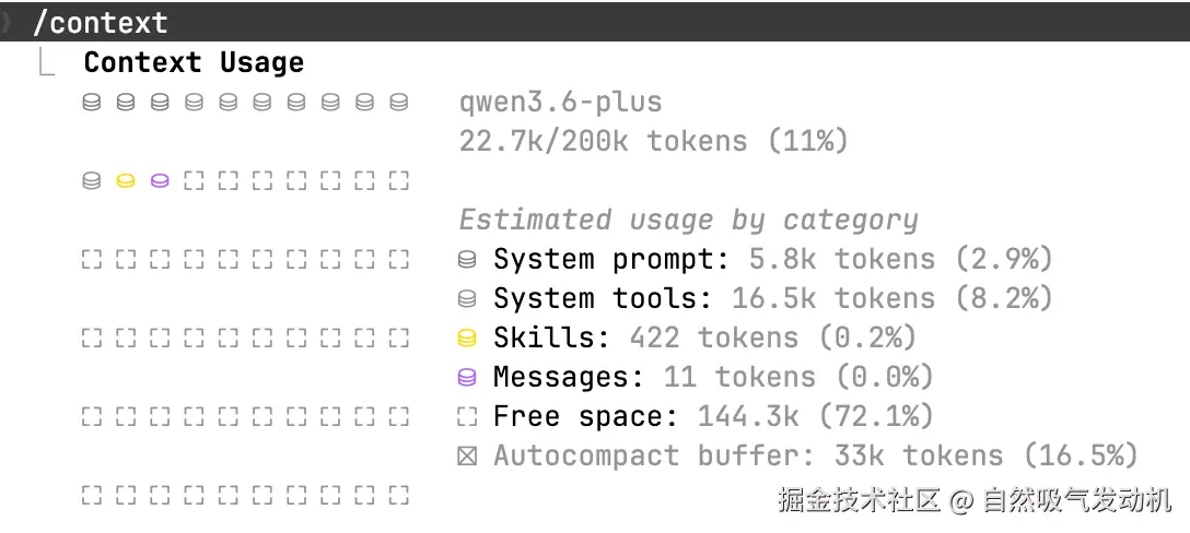 看看当前会话的上下文情况。长时间对话之后,如果感觉 Claude 开始"记不得"前面说啥了,敲一下 /context 看看,如果发现上下文都塞满了,需要先 /compact 再继续聊。