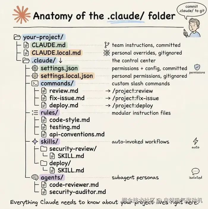 本节知识点的内容用下面的这个图来做下总结(图片来源自:blog.dailydoseofds.com/p/anatomy-o...)这两张图里详细介绍了项目实践中怎么去管理和定义.claude 文件夹的内容,协助整个团队提升效率和统一规范。