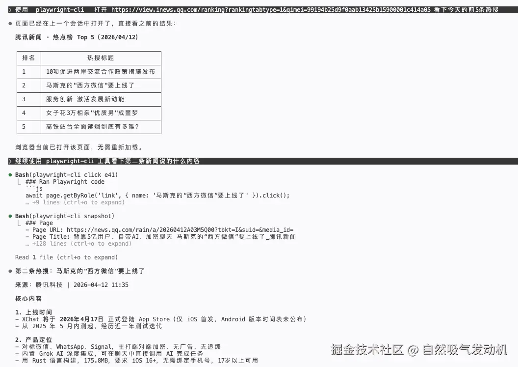 这里在我的日常使用中比较推荐使用 playwright-cli 工具,通过这个工具可以直接让 cluade code 在控制台直接去使用浏览器去访问指定网页并总结网页中的内容,实现效果如下: