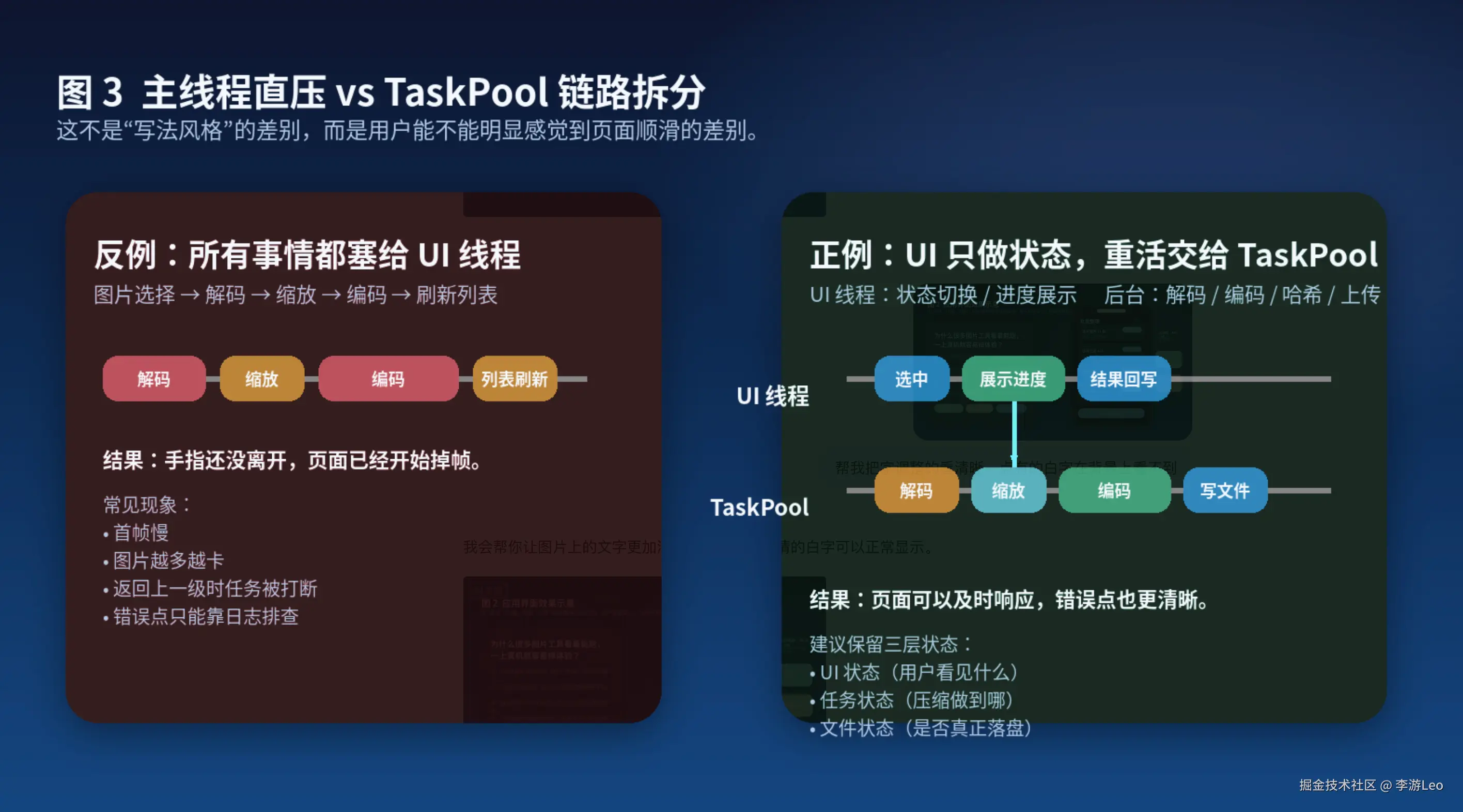 - UI 线程只维护"当前选了什么、处理到哪一步、最终展示什么"。