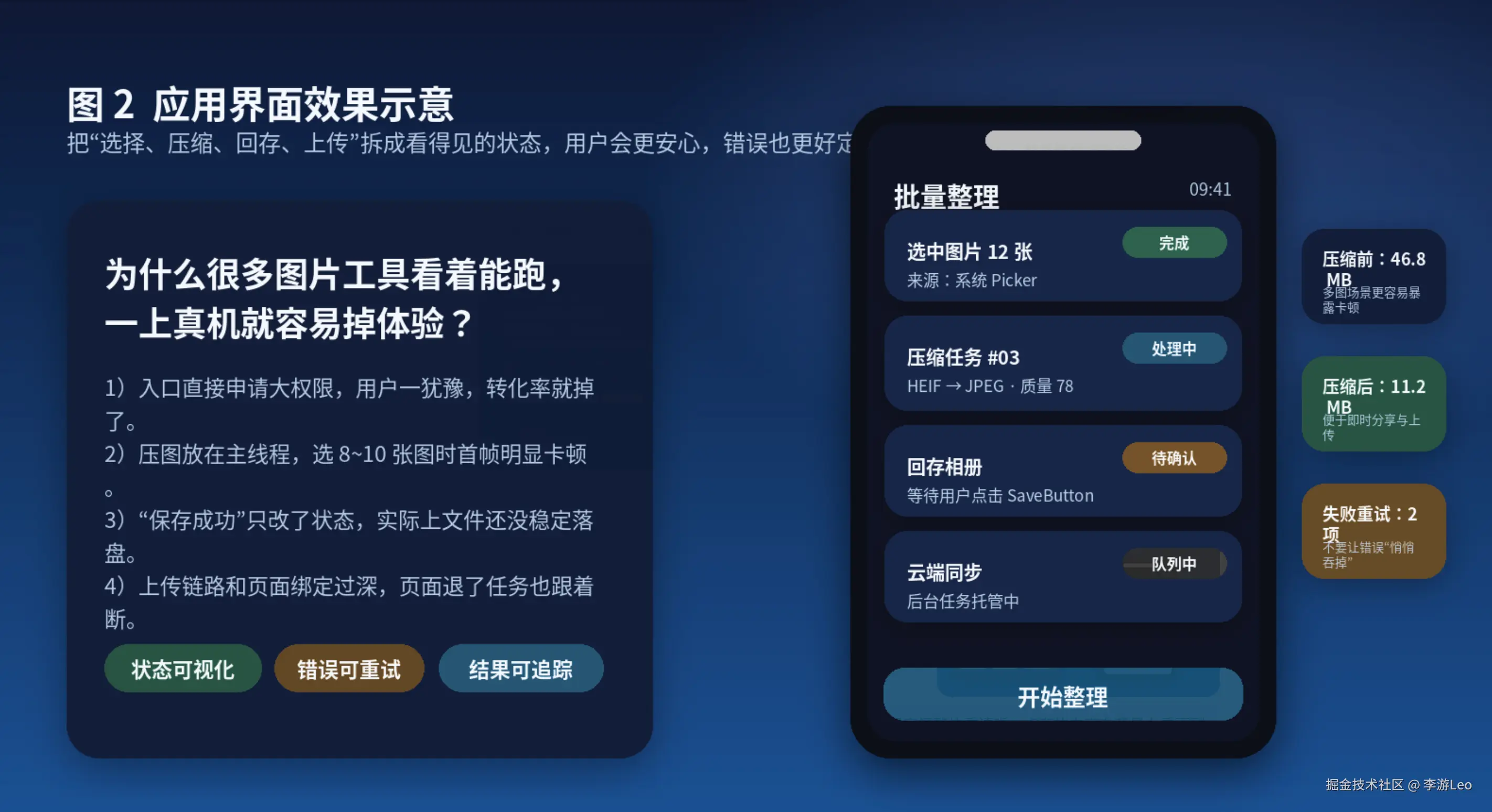 用户选了十几张图,页面不能卡;处理完了,结果要能稳定回存;页面退到后台以后,上传也别说没就没。