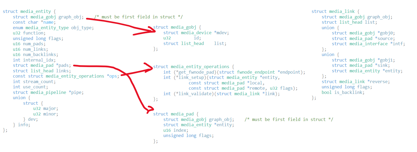 这几个结构体,都嵌入到media_entity结构体中,他们给media_entity提供了对应的能力,它嵌入到v4l2-subdev中,使得它也具备这个能力。注册v4l2-subdev的时候,初始化pad,初始化这个subdev的能力。