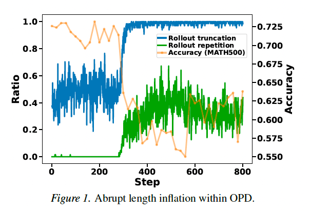 量化指标的提出: 论文定义了"截断率(Truncation Rate)"和"重复率(Repetition Rate)"作为监控 OPD 训练动态的关键指标,为诊断此类问题提供了工具。