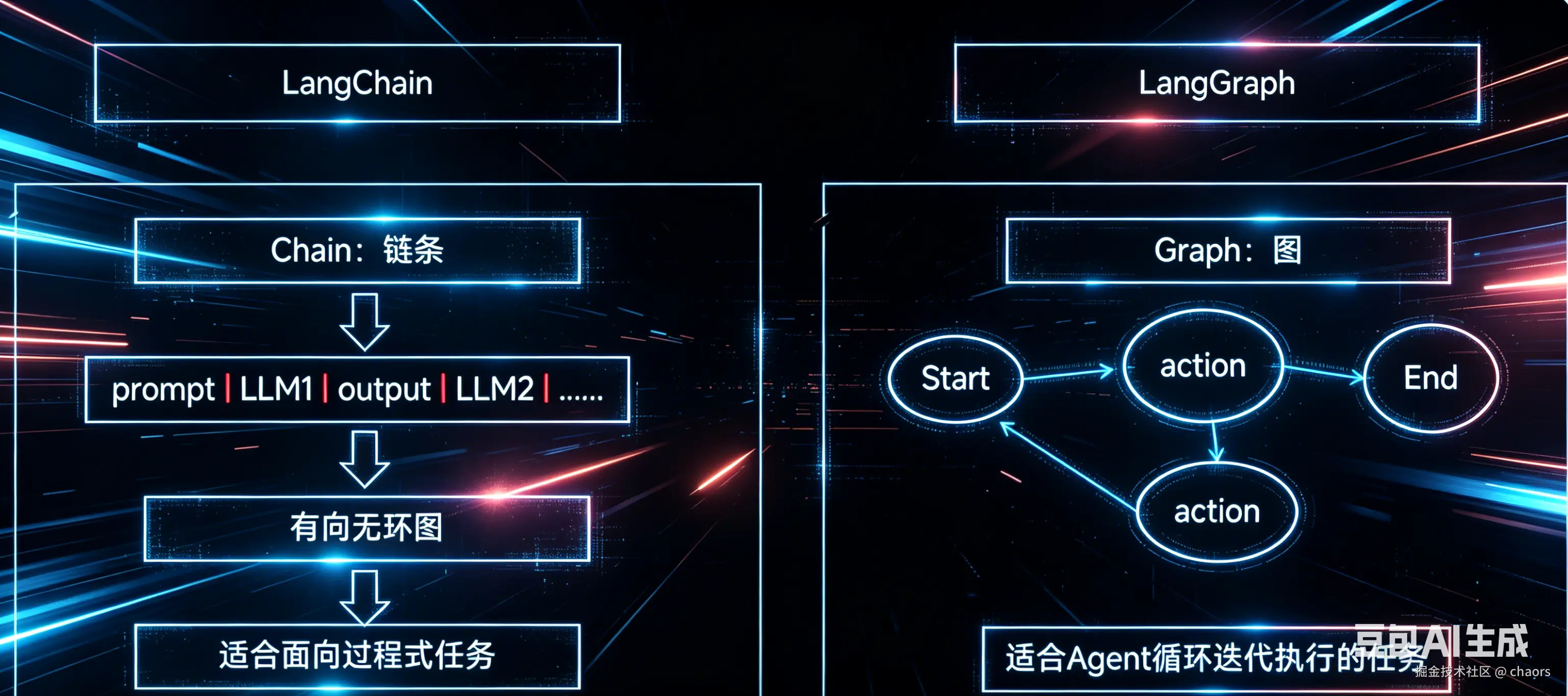 | 核心抽象 | 链(线性、确定性执行流水线,用LCEL串联组件) | 状态图(有向图,节点=执行单元,边=流转条件,全局State对象) |