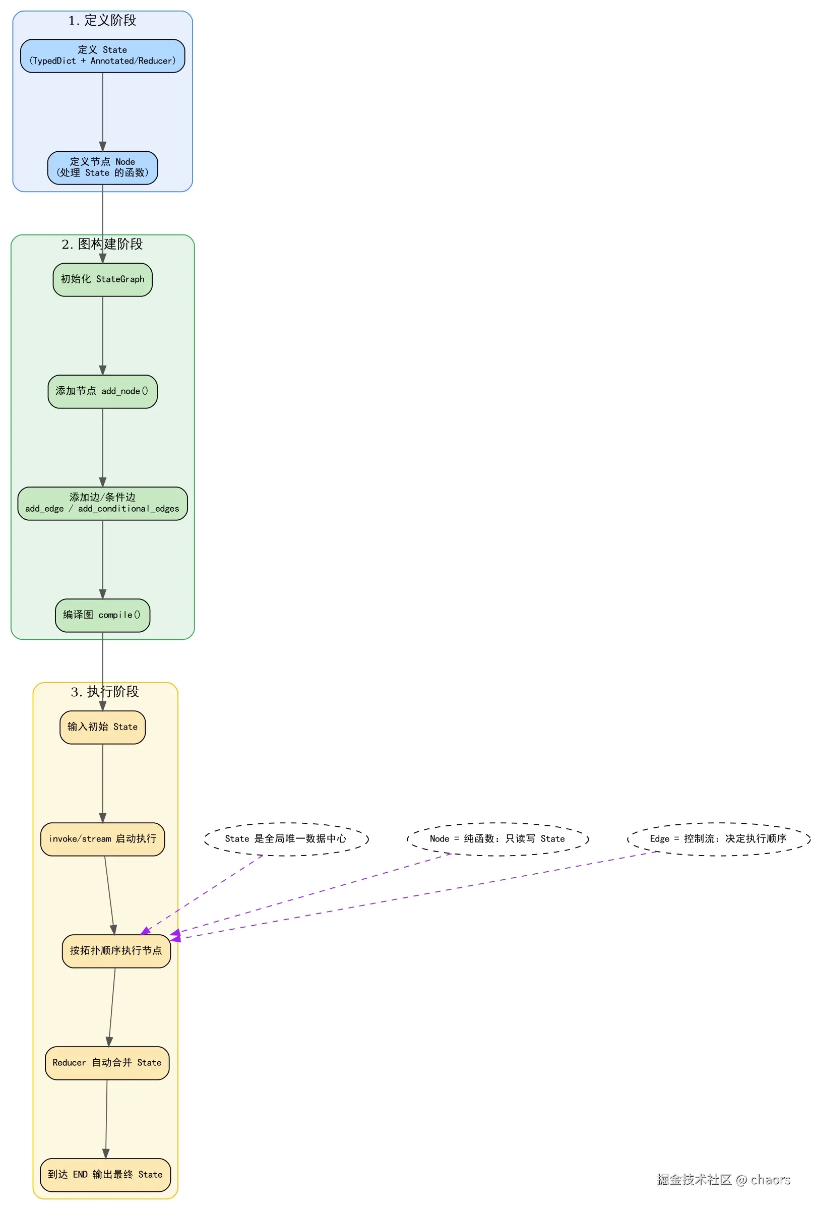 State为核心,节点修改State后,边根据新状态决定下一步走向(支持循环、回溯、多Agent协作); -