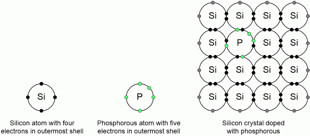中:磷原子(5价, 最外层5个电子), 作为施主杂质