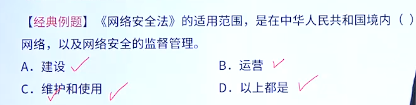 网络安全法倒是比较简单,都是些常识题目,比如下面例题,其实题目已经把答案说出来了,而且可以直接将选项带入题干中,就只有网络安全最合适