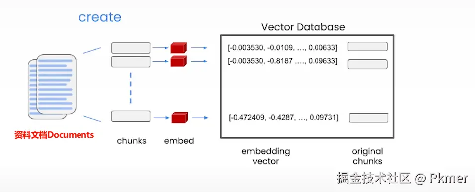 - 我们将我们的庞大的资料文档,切成小块的文本块(chunk),向量化之后,存储到向量数据库中