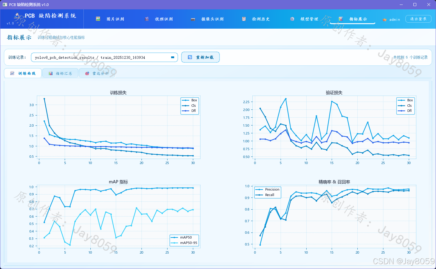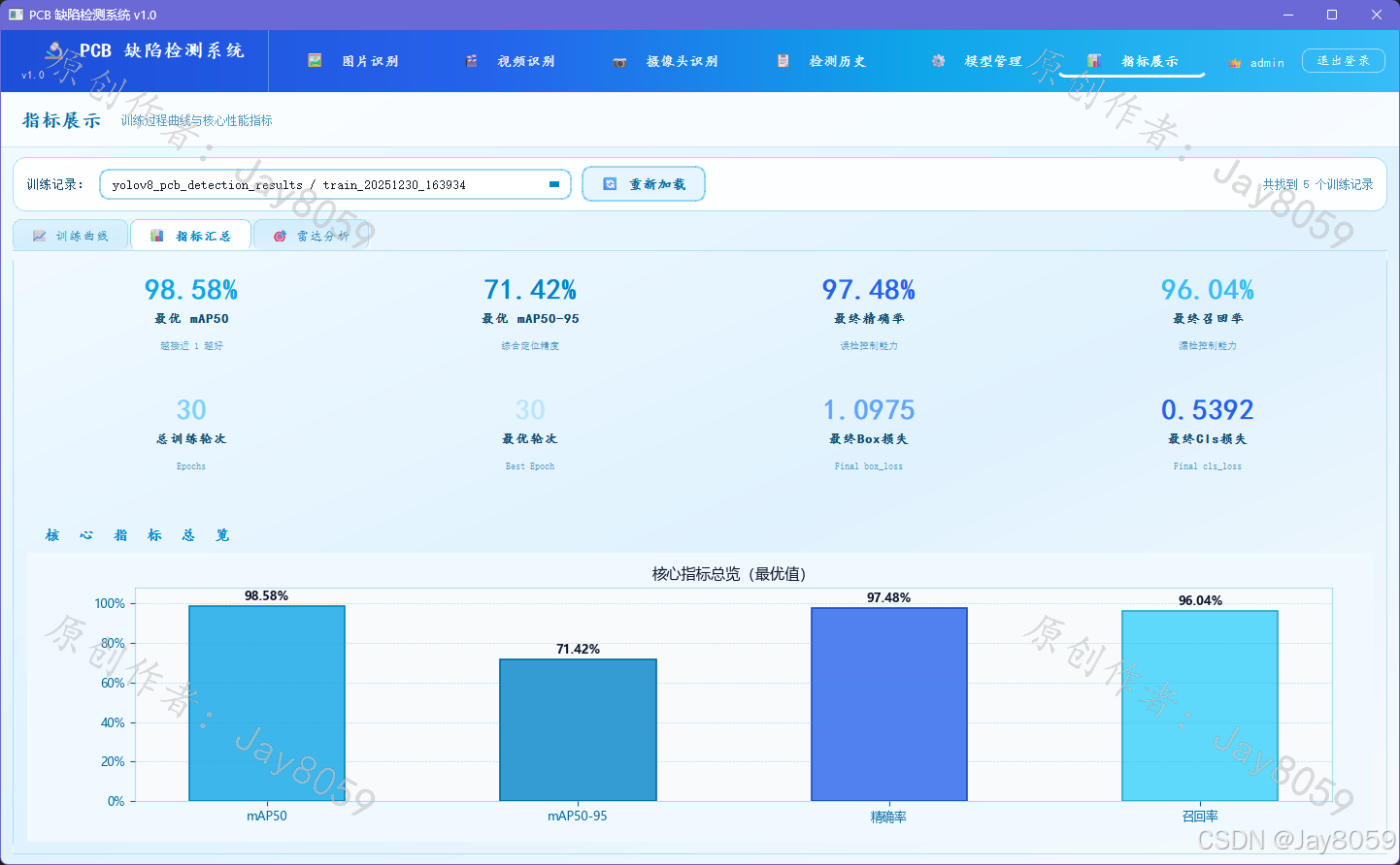 - 指标汇总页:卡片式展示最优 mAP50、mAP50-95、精确率、召回率、最优轮次、损失值,以及核心指标柱状图