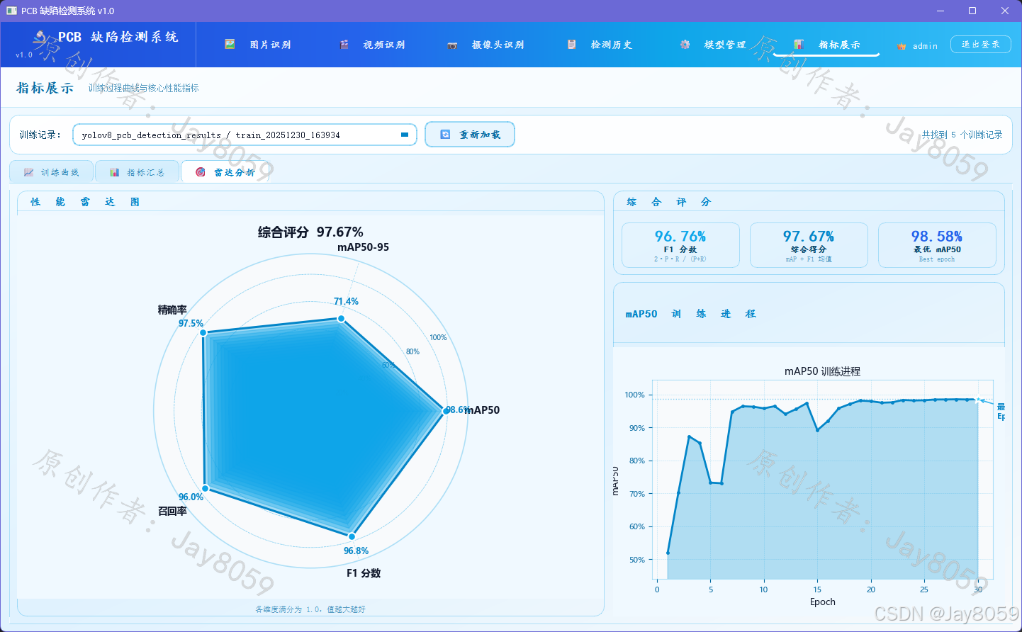 - 雷达分析页:雷达图多维度综合展示 mAP50、mAP50-95、精确率、召回率、F1 分数,并附 mAP50 趋势面积图和综合评分