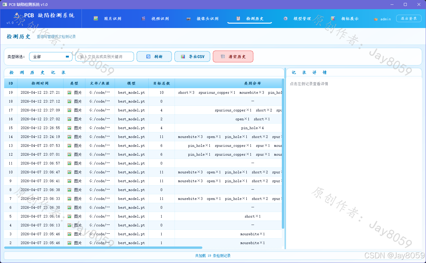 - 支持按检测类型(图片/视频/摄像头)筛选,支持关键词搜索