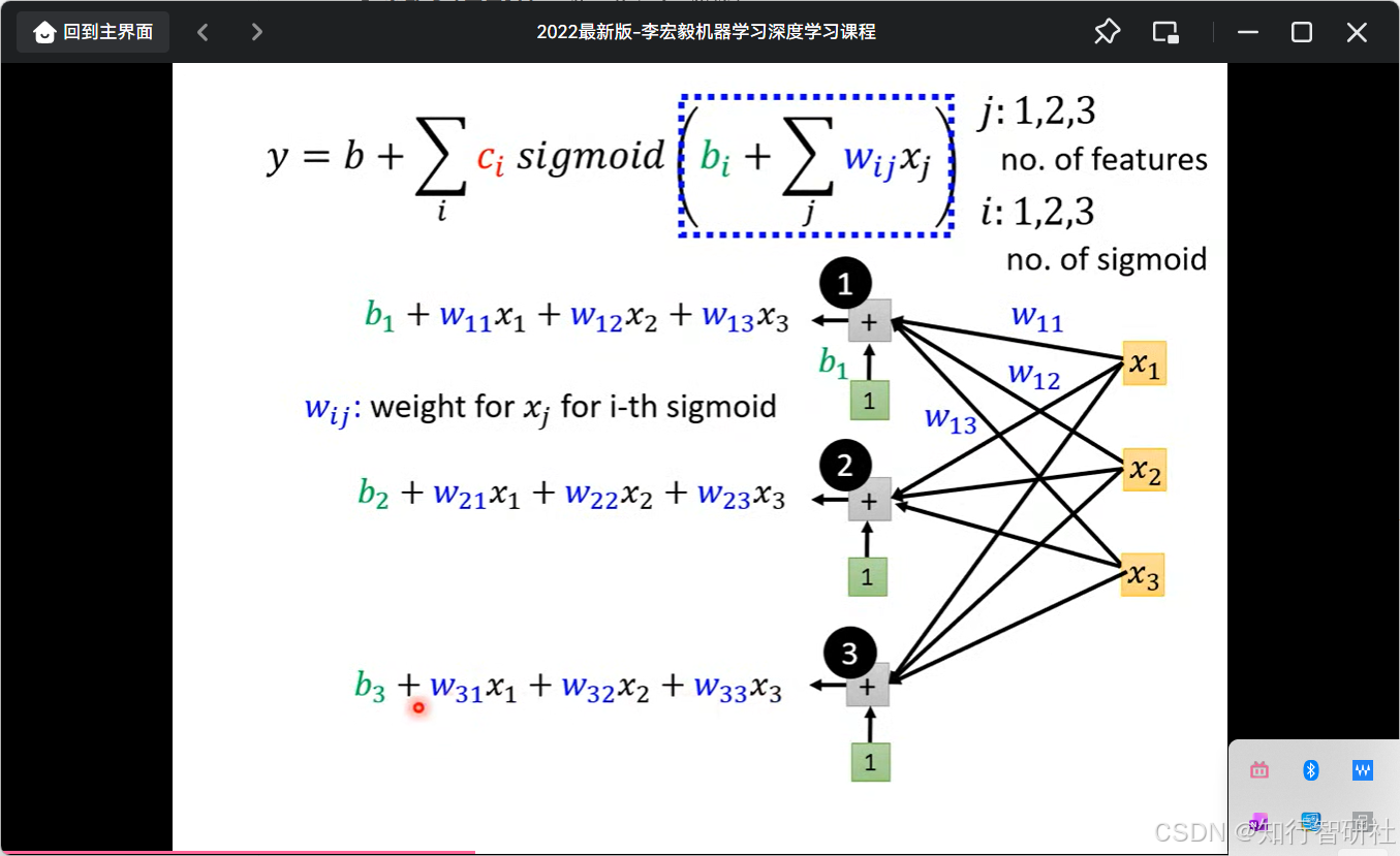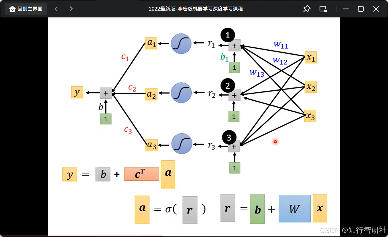 - 公式 4(最下方): y=b+∑icisigmoid(bi+∑jwijxj)y = b + \sum_i c_i \text{sigmoid}(b_i + \sum_j w_{ij} x_j)y=b+∑icisigmoid(bi+∑jwijxj)