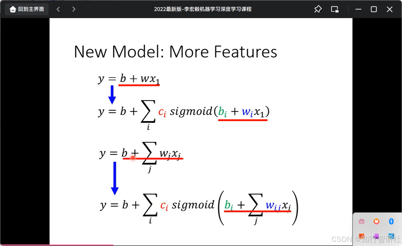 - 公式 2(第二行): y=b+∑icisigmoid(bi+wix1)y = b + \sum_i c_i \text{sigmoid}(b_i + w_i x_1)y=b+∑icisigmoid(bi+wix1)