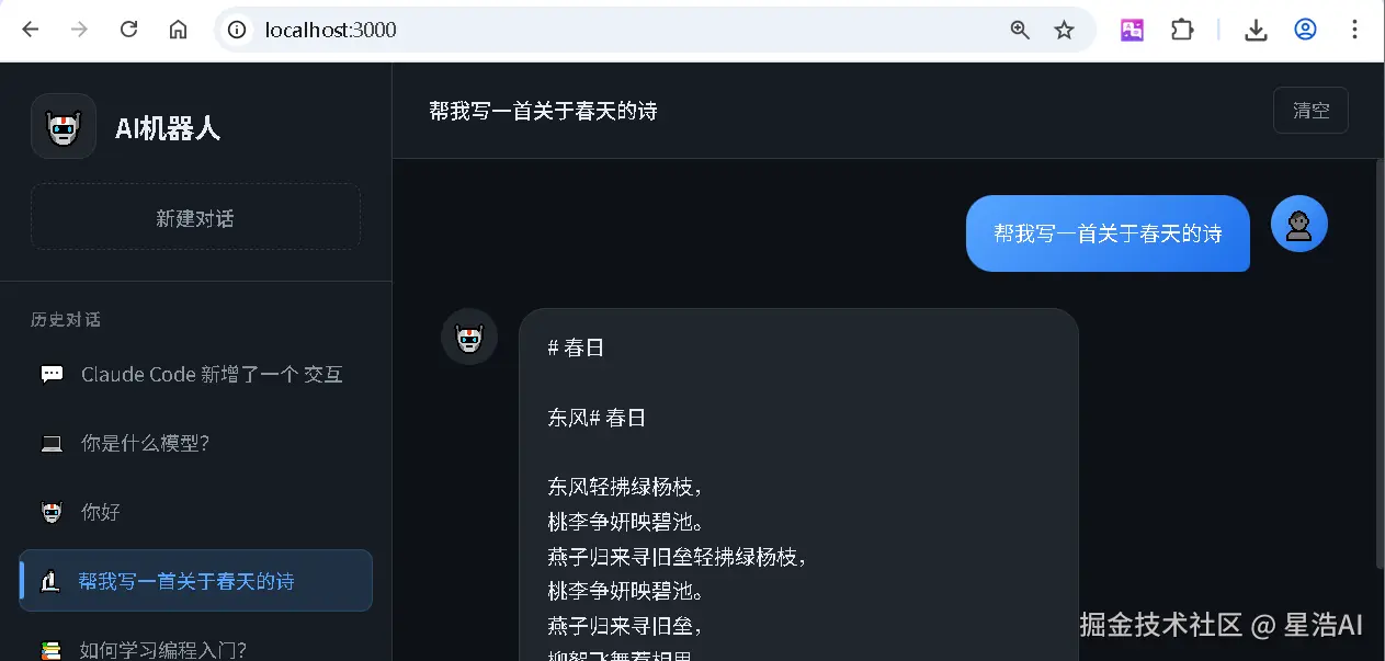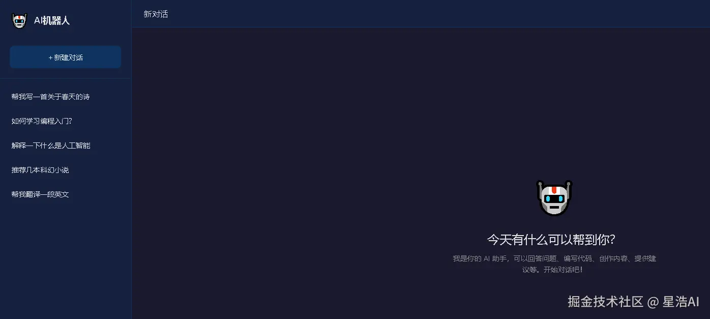 | 界面布局 | 左侧历史会话列表 + 右侧聊天主区域,深色主题 |
