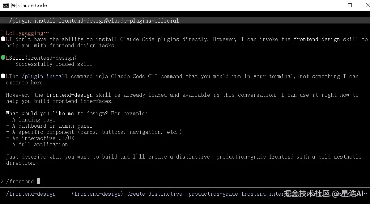 安装完成后,Claude Code 会提示安装成功,下一次涉及前端的对话中它就会自动生效。