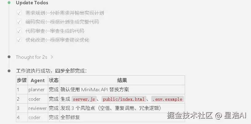 | 代码质量 | 依赖单次生成质量,无内置审查 | 分阶段审查(Reviewer 自动检查),质量更可控 |